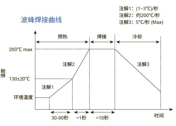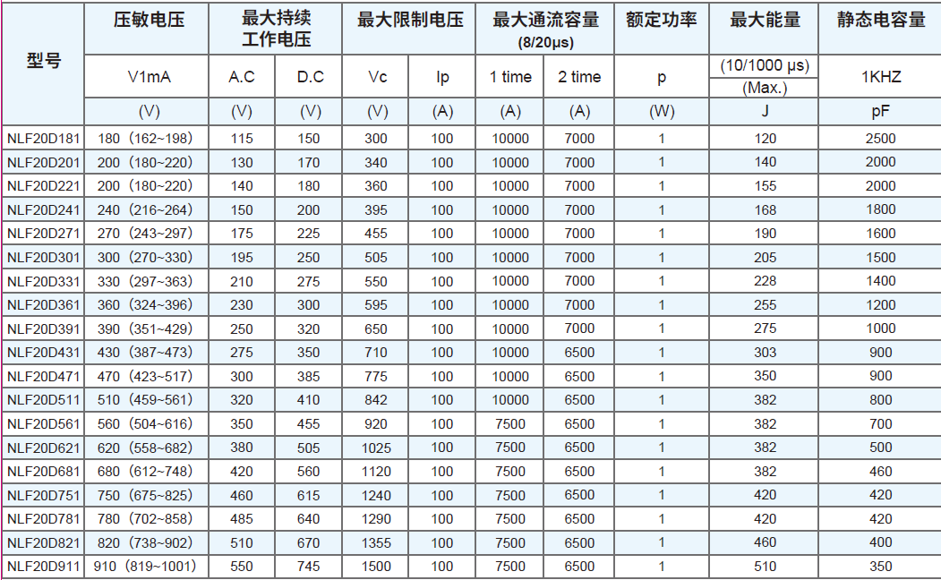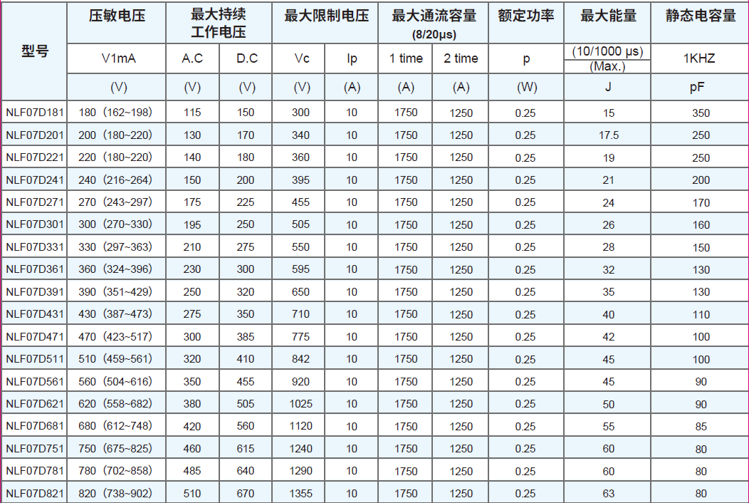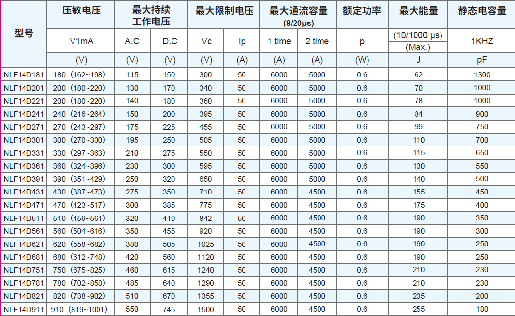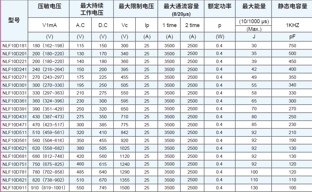 符合 RoHS、HF、REACH 要求 本體尺寸:Ф7mm ~ Ф20mm 寬工作電壓范圍:180 Vac ~ 1000 Vac 寬工作溫度范圍:-40℃ ~ +85℃ 儲存溫度范圍:-40℃ ~ +125℃ 安規(guī)認證:CQC 抑制浪涌電流的能力強 低漏電流 優(yōu)越的限制電壓特性 徑向引線環(huán)氧樹脂封裝 命名規(guī)則 結(jié)構(gòu)與尺寸 07D系列壓敏電阻對照表 10D系列壓敏電阻對照表 14D系列壓敏電阻對照表 20D系列壓敏電阻對照表 額定值減額曲線 沖擊電流波形 (8/20μS) 推薦焊接條件 倉庫存儲條件 存儲條件:1. 儲存溫度:-10℃~+40℃ 2. 相對濕度:≦75%RH 3. 不要將本產(chǎn)品存放在有腐蝕性氣體或是陽光直接照射的環(huán)境中保管。 存儲期限:1 年