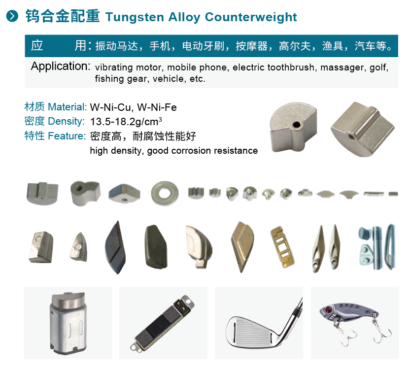 高比重合金主要運用于機械用的平衡錘,配重桿,飛鏢桿,高爾夫球配重塊,手機、游戲機振子,航空航天的陀螺儀, 鐘表擺錘,醫(yī)療器械,高比重電觸點,軍用穿甲彈,子母彈等等。