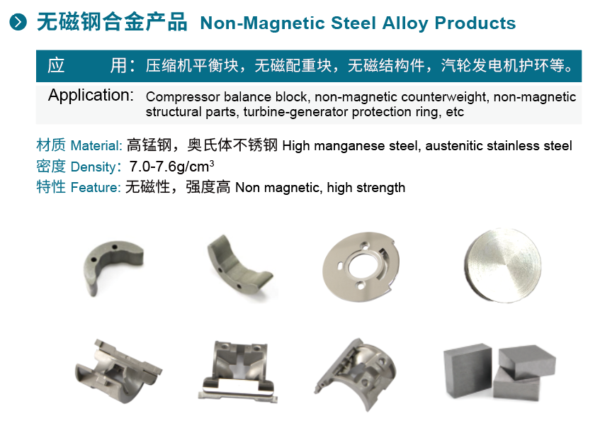 ◆ 應(yīng)用:壓縮機(jī)平衡塊、無磁配重塊、無磁結(jié)構(gòu)件、汽輪發(fā)電機(jī)護(hù)環(huán)等