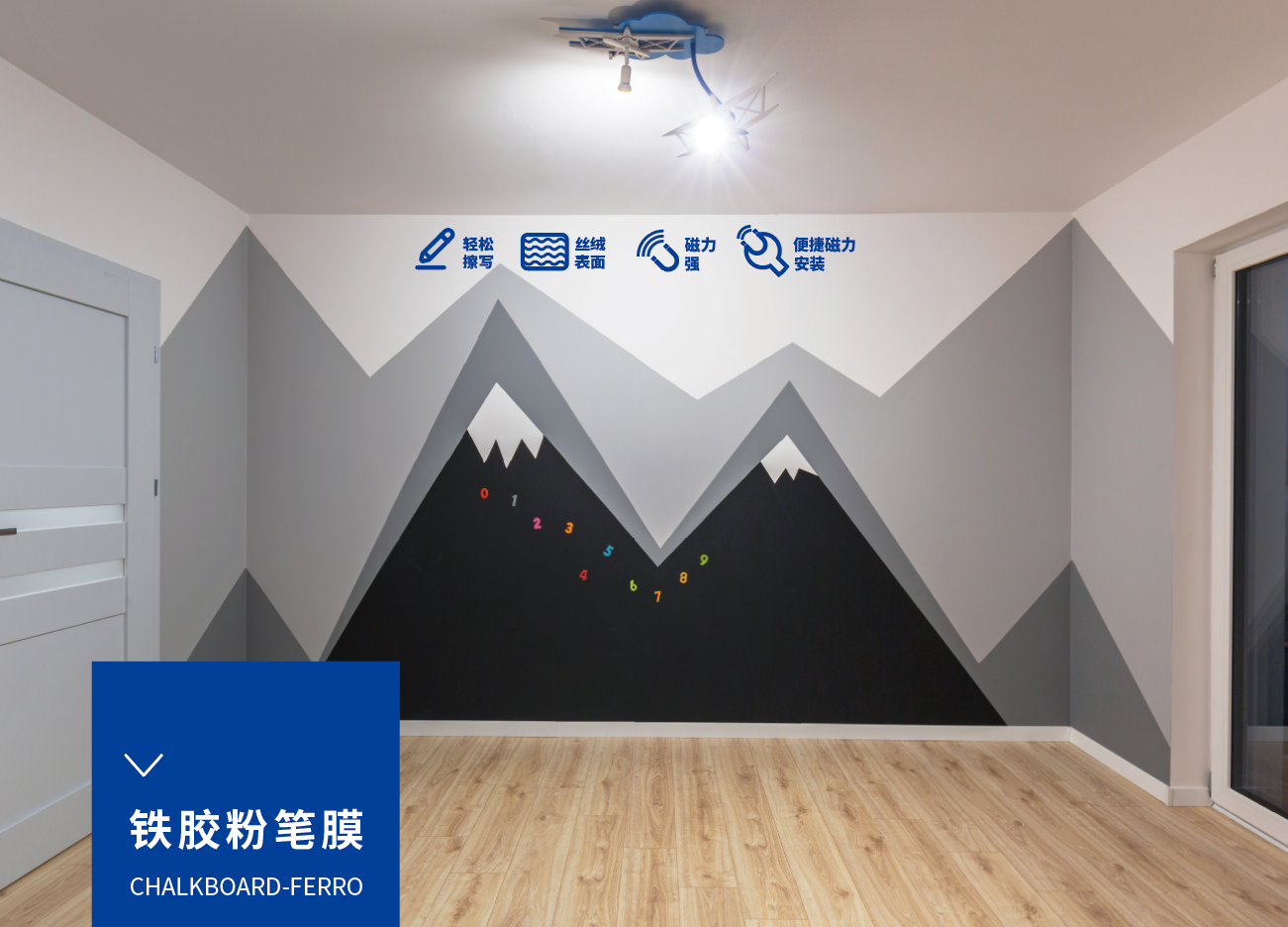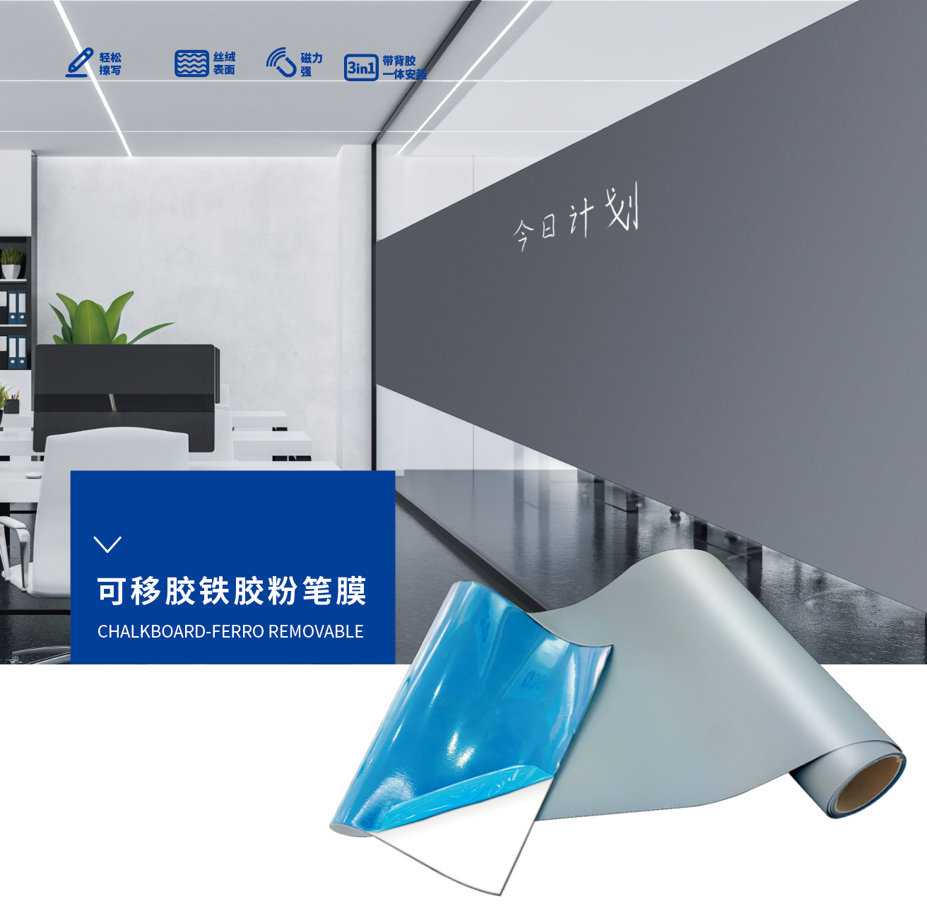 鐵膠粉筆膜可以直接吸附在磁膠基底上,磁性吸附無(wú)氣泡,輕松張貼、移除和更換。鐵膠粉筆膜還可以與背膠、可移膠、墻紙基層等材料相結(jié)合,作為一種高檔且多功能的室內(nèi)裝飾材料應(yīng)用于教室、家庭、藝術(shù)工作室、餐廳、辦公室等各種場(chǎng)合。